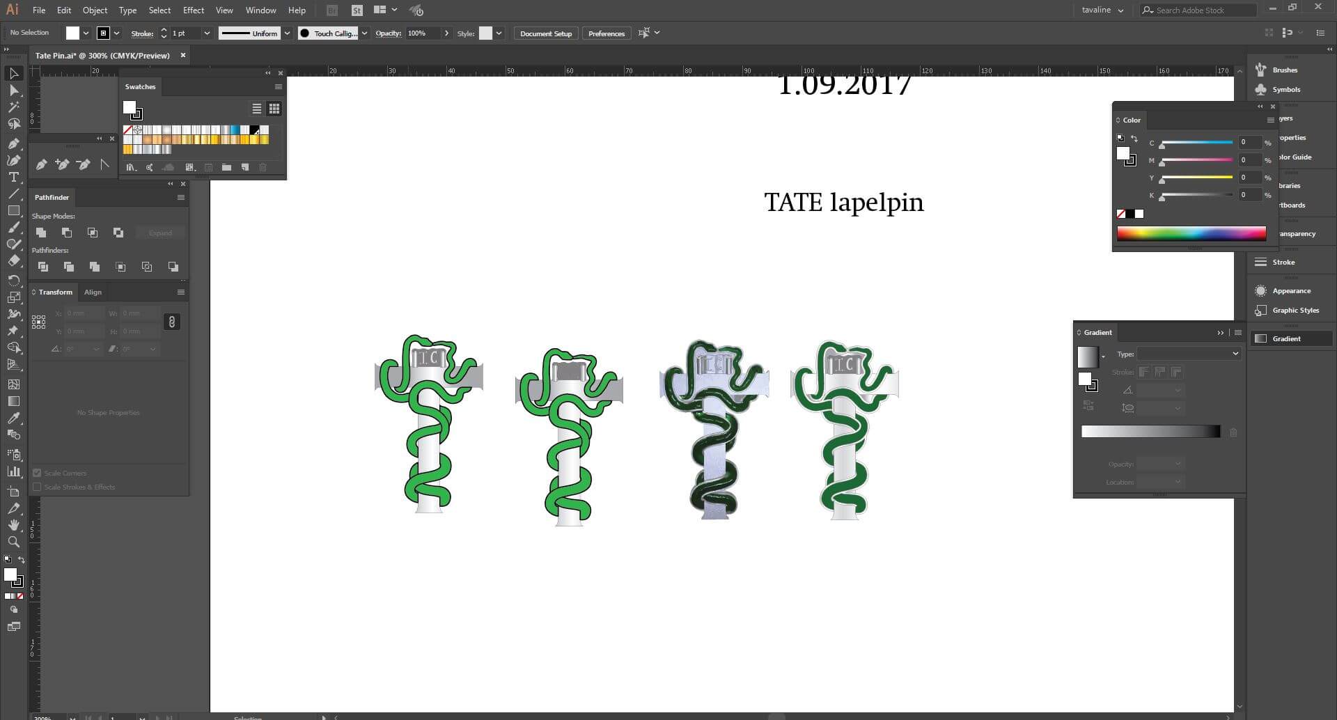 Работа выполнена на прессе из серебра 925-й пробы, покрыта горячей эмалью и оксидирована. И для фирмы Roman Tavast это был в каком-то смысле уникальный проект. Обычно горячую эмаль шлифуют, но в данном случае мы оставили ее неотшлифованной, чтобы лучше подчеркнуть объемность змея. По первоначальному дизайну серебряные части значка должны были быть блестящими, но для достижения более дорогого эффекта мы решили серебро оксидировать.